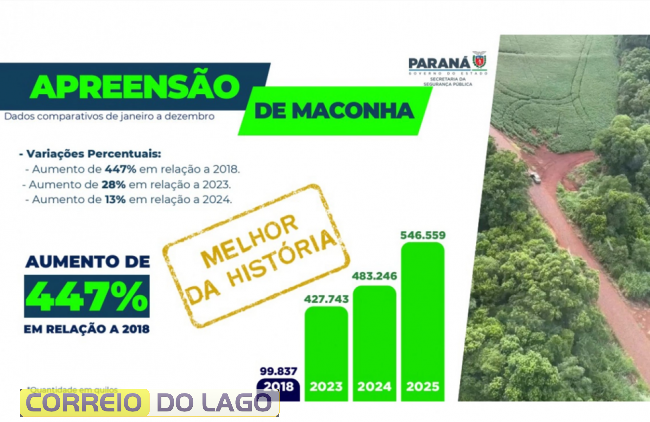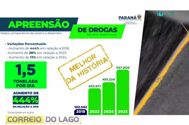O Paraná alcançou, em 2025, o maior volume de apreensões de drogas de sua história e se consolidou como referência nacional no enfrentamento ao narcotráfico. Ao longo do ano, as forças de segurança retiraram de circulação 557,8 toneladas de entorpecentes, o que representa uma média de 1,5 tonelada por dia e um prejuízo estimado em mais de R$ 2 bilhões às organizações criminosas.