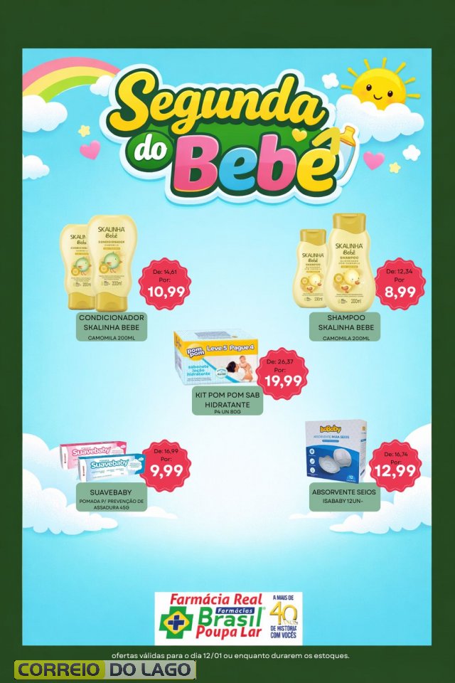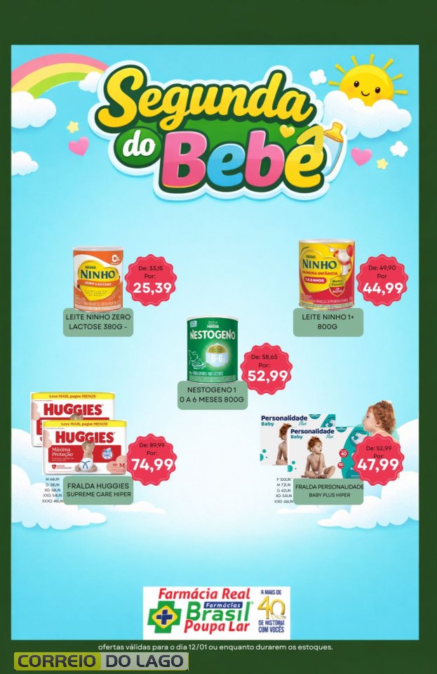 Se você precisa repor o estoque ou aproveitar bons preços, esse é o momento certo. As ofertas são válidas somente hoje ou enquanto durarem os estoques. Passe na Farmácia Real e aproveite a Segunda do Bebê. Farmácia Real, Rede Brasil Poupa Lar — mais de 40 anos cuidando de você e da sua família.