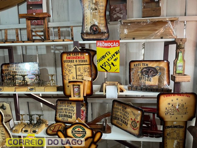 A linha de servir também chama atenção, com variedade de produtos como tábuas de corte e para frios, gamelas de madeira para petiscos e placas decorativas com diversos temas, perfeitas para dar personalidade ao espaço.