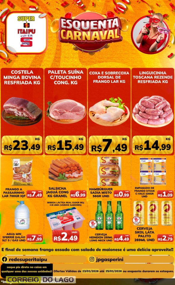 Nesta sexta-feira (23), o Super Itaipu e o Super Santa Helena apresentam os encartes Sexta-feira Impactante e Esquenta de Carnaval, com ofertas especiais para quem quer fazer as compras com tranquilidade e economia. São preços baixos em diversos produtos, garantindo praticidade, variedade e boas oportunidades para preparar o Carnaval e abastecer a casa sem pesar no bolso.