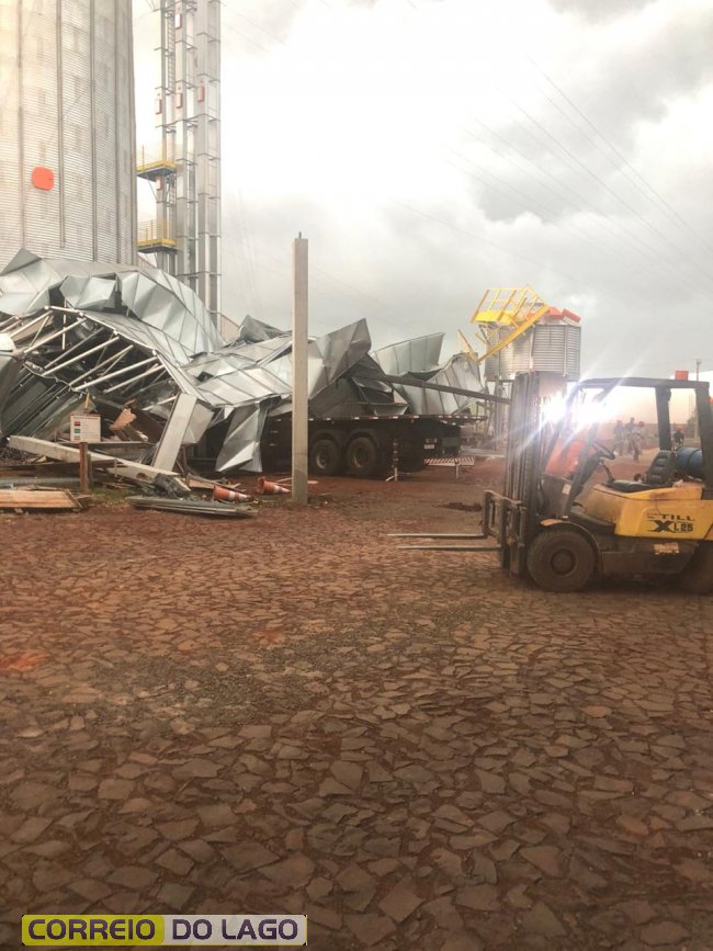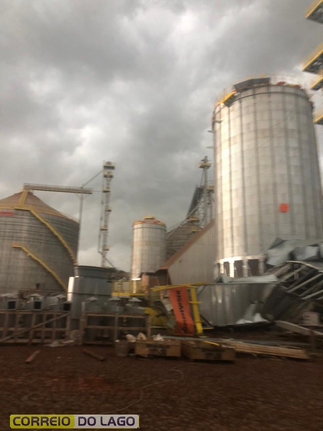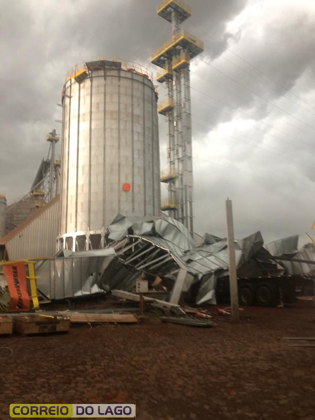 A estrutura metálica acabou tombando em uma propriedade rural após rajadas de vento registradas na região. O equipamento fazia parte de uma estrutura de armazenamento de grãos que estava em fase de construção em uma cooperativa do município.