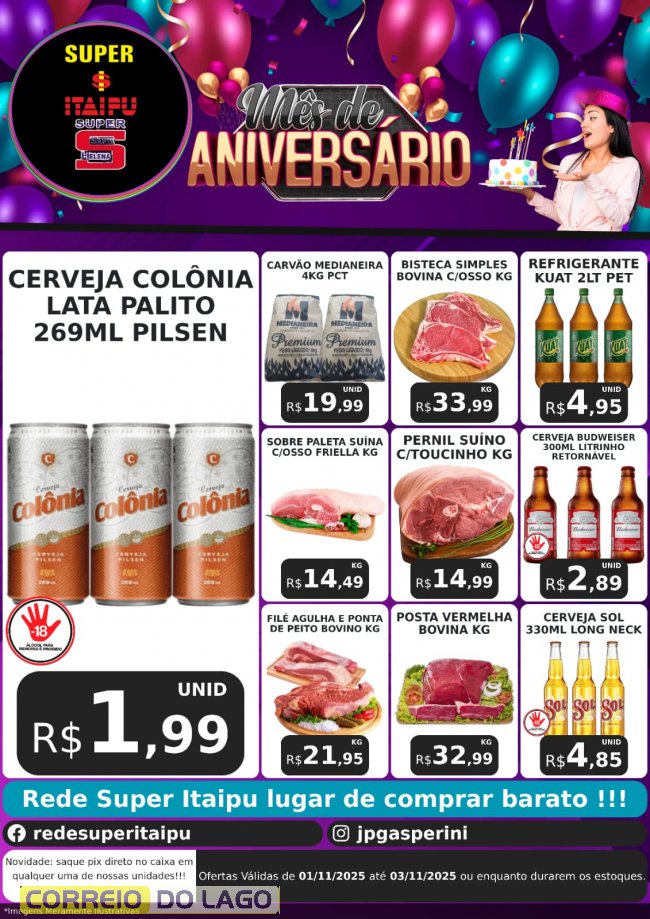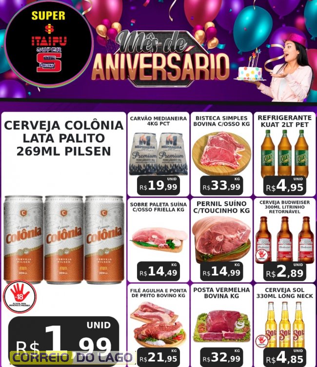 Nesta segunda-feira (3), Super Itaipu e Super Santa Helena celebram seu mês de aniversário com ofertas especiais em diversos produtos. A promoção é válida apenas hoje, garantindo aos clientes preços mais baixos e ótimas oportunidades de compra.