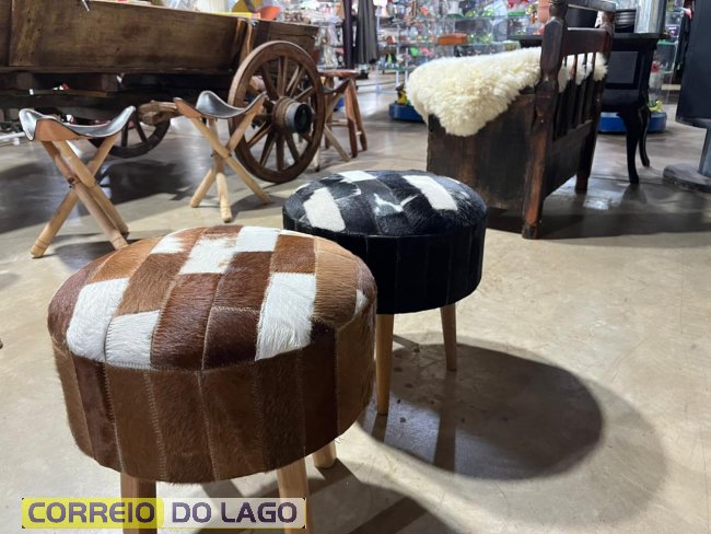 Entre os destaques estão tapetes de couro de boi inteiro, disponíveis em várias cores, além de modelos com padrão xadrez. A loja também conta com passadeiras, puffs e cadeiras revestidos em couro, ideais para valorizar a decoração.