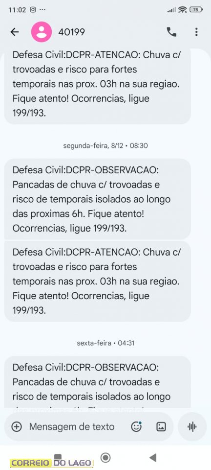 Ao longo do dia, a Defesa Civil emitiu alertas à população por meio de mensagens SMS, informando sobre a possibilidade de temporais isolados nas próximas seis horas. O aviso reforça o risco de chuva intensa, descargas elétricas e rajadas de vento, orientando a comunidade a adotar medidas preventivas diante do avanço das instabilidades.