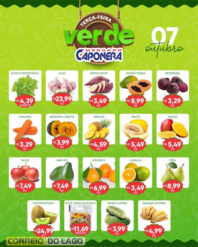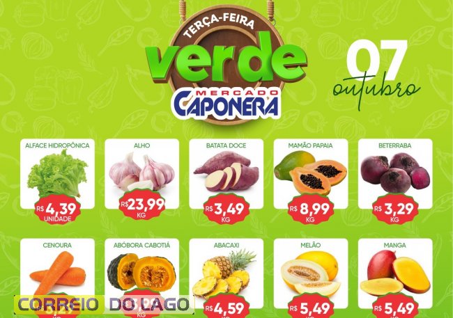 Nesta terça-feira (7), o Mercado e Açougue Caponera preparou uma promoção especial para você economizar. A seção de hortifruti está repleta de ofertas exclusivas, com frutas, verduras e legumes fresquinhos a preços imperdíveis.