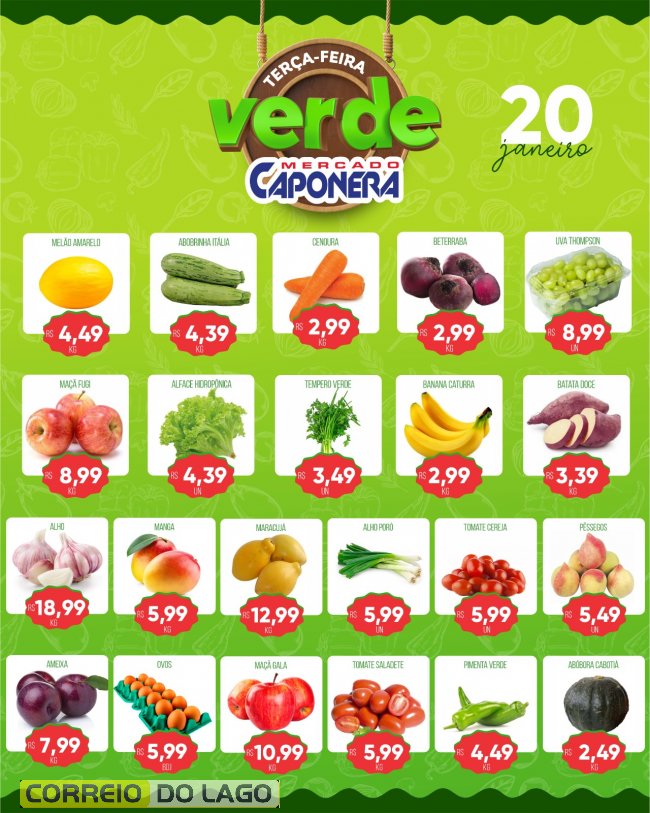 O Mercado Caponera realiza nesta terça-feira (20) a Terça Verde, com promoções em produtos frescos e saudáveis. Qualidade e economia em Santa Helena.