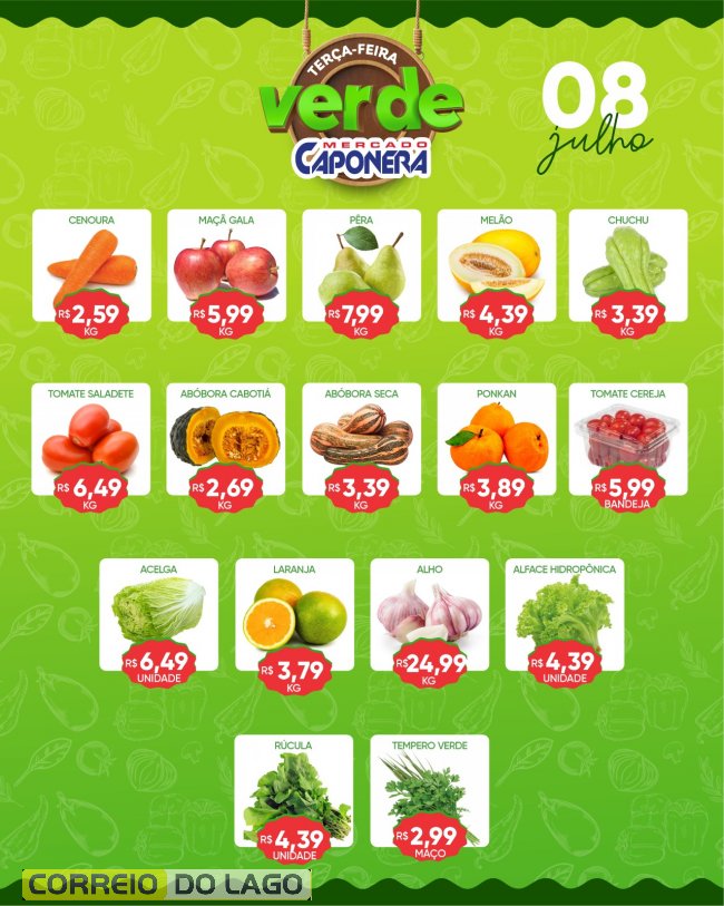 Nesta terça-feira (08), o Mercado Caponera preparou uma promoção especial para você economizar sem abrir mão da qualidade. A seção de hortifruti está repleta de ofertas exclusivas, com frutas, verduras e legumes fresquinhos a preços imperdíveis.