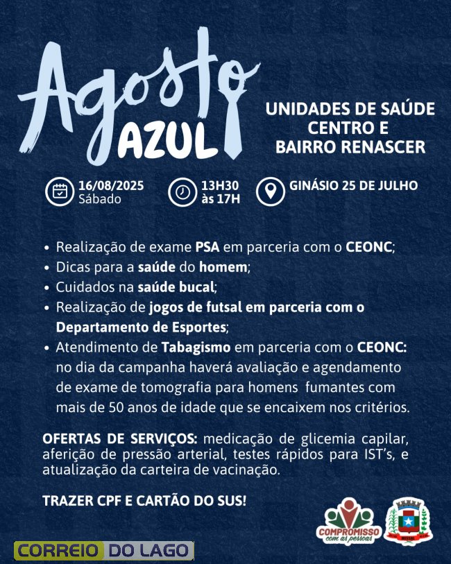 Unidades de Saúde do Centro e Bairro Renascer em Missal terão ação alusiva ao Agosto Azul no próximo sábado no Ginásio 25 de Julho