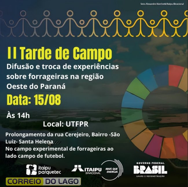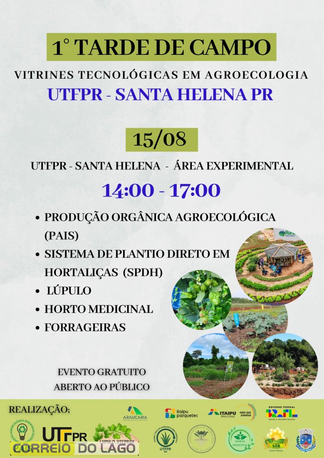 A Universidade Tecnológica Federal do Paraná (UTFPR) – Campus Santa Helena realiza nesta sexta-feira (15) a Tarde de Campo com foco em vitrines tecnológicas em agroecologia. O evento acontece das 14h às 17h, no campo experimental de forrageiras, localizado ao lado do campo de futebol, com acesso pela Rua Cerejeiro, no Bairro São Luiz.