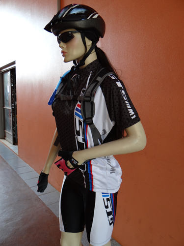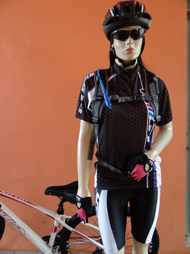 Roupas especiais para ciclistas, diversos tipos de capacete e outros equipamentos necessários para quem gosta de circular e até praticar esportes.