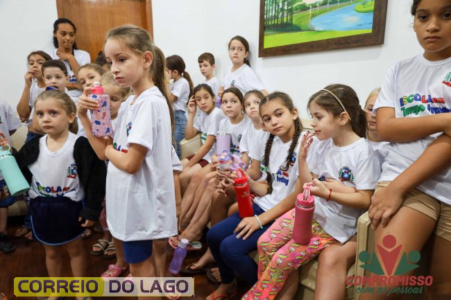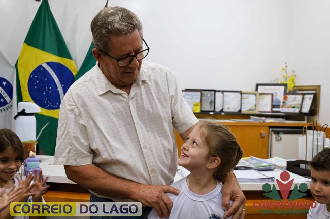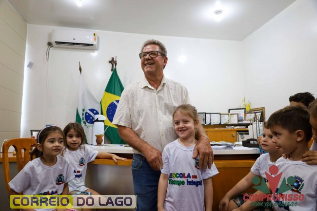 Durante a visita, os alunos também estrearam os novos uniformes destinados à educação em Tempo Integral, adquiridos pela administração municipal. Foram entregues camisetas e bermudas para os estudantes que participam do programa, reforçando a identidade e organização das atividades escolares.