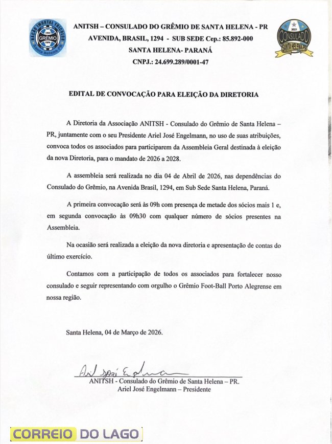 A Diretoria da Associação ANITSH – Consulado do Grêmio de Santa Helena (PR), juntamente com seu presidente, Ariel José Engelmann, no uso de suas atribuições, convoca todos os associados para participarem da Assembleia Geral destinada à eleição da nova Diretoria para o mandato 2026/2028.