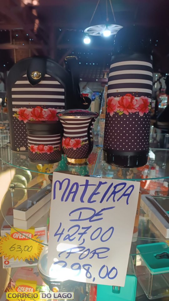 Entre os destaques estão os kits completos de chimarrão, que estão com 30% de desconto. Um dos exemplos é a mateira do Grêmio, que passou de R$ 394,00 para R$ 269,00. A loja conta com diversos modelos disponíveis, incluindo opções na cor rosa e outros designs trabalhados, todos dentro da campanha promocional.