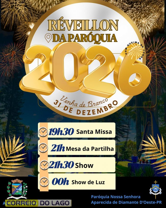 Encerrando as atividades, no dia 31 de dezembro, a Paróquia realiza o Réveillon da Paróquia 2026, convidando a comunidade a participar vestida de branco. A programação começa às 19h30, com Santa Missa, seguida da mesa da partilha às 21h, show com música ao vivo às 21h30 e show de luzes à meia-noite. Toda a programação do Réveillon será gratuita.
