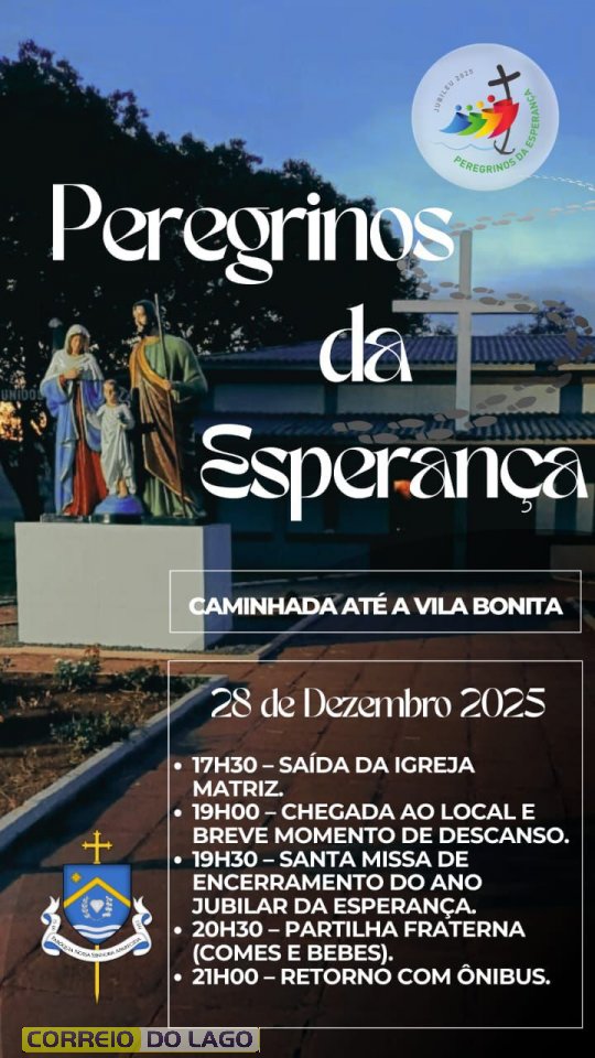 No dia 28 de dezembro, acontece a Caminhada Peregrinos da Esperança, com um percurso de aproximadamente 8 quilômetros, saindo da Igreja Matriz com destino à Comunidade da Vila Bonita. A saída está prevista para 17h30, com chegada às 19h, seguida de breve descanso. Às 19h30 será celebrada a Santa Missa de encerramento do Ano Jubilar da Esperança. A programação segue com partilha fraterna (comes e bebes) às 20h30, e retorno de ônibus às 21h.