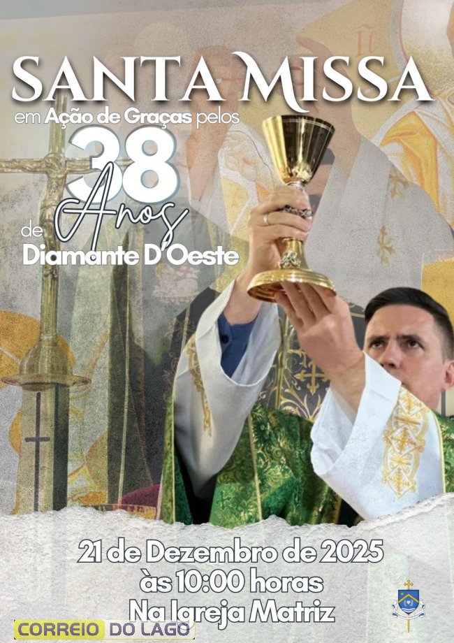 No dia 21 de dezembro, a programação inicia com a Santa Missa em Ação de Graças pelos 38 anos de emancipação de Diamante D’Oeste, celebrada às 10h, na Igreja Matriz. Na sequência, a partir das 12h, será realizado o almoço comemorativo, conhecido como a maior feijoada da Costa Oeste, no Salão Paroquial. O valor é de R$ 30,00 por pessoa, para participantes acima de 12 anos.