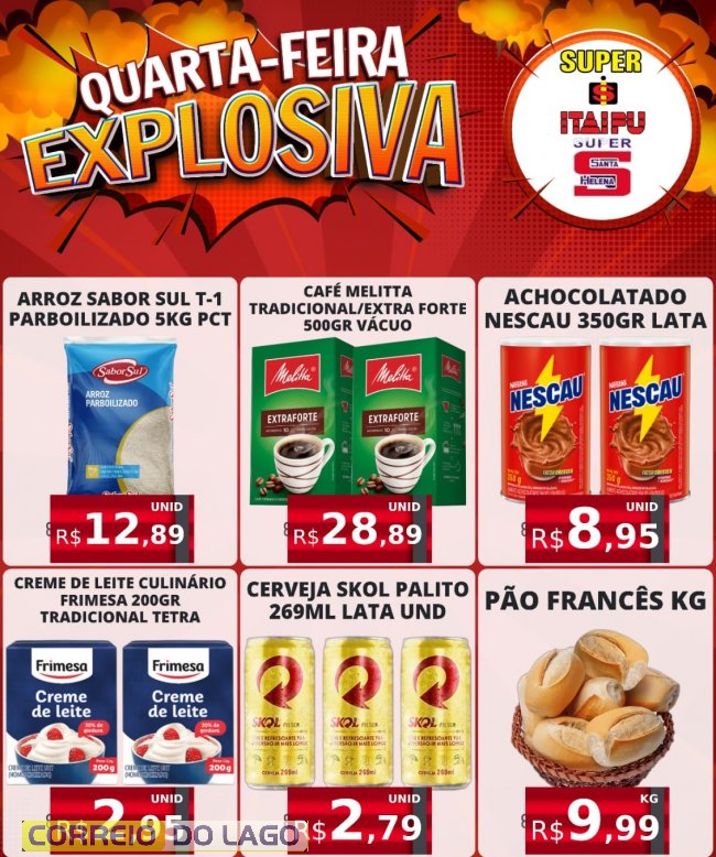 Os supermercados Super Itaipu e Super Santa Helena promovem nesta quarta-feira duas campanhas especiais de economia para os clientes: a “Quarta-feira Explosiva” e as “Super Ofertas do Hortifruti”. A ação reúne preços reduzidos em diversos produtos do dia a dia, desde itens básicos da despensa até frutas, legumes e verduras selecionados, oferecendo uma oportunidade para quem deseja aproveitar boas ofertas e abastecer a casa com mais economia.