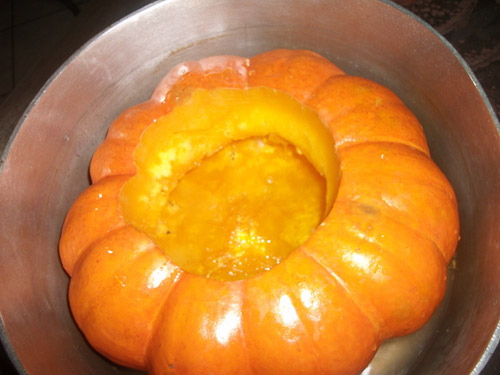 Quando perceber que a abóbora já está cozida (furando-a com um garfo), retire com uma concha parte da calda que está em seu interior e coloque dentro da panela para cozinhar só mais um pouquinho. E deixe tampada com o fogo desligado.