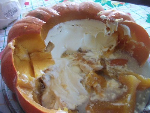 Quando for servir a sobremesa, retire o restante da calda que está no interior da abóbora e coloque ao redor no refratário. No interior da abóbora coloque ***dois potes de nata e um creme de leite misturados. Se preferir decore com raspas de limão ou côco em flocos.