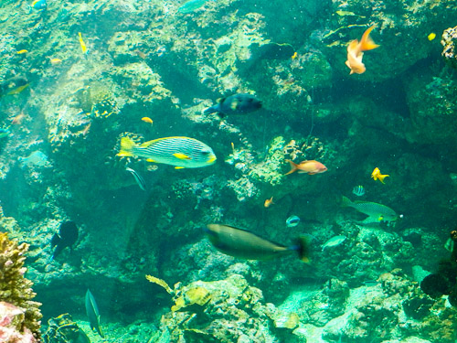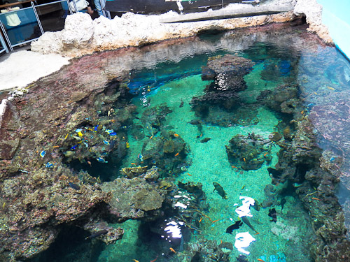 Primeira janela na imensidão oceânica: de frente para uma janela inclinada, você literalmente mergulha no azul com raias e tubarões. No entanto, as falésias estão lá para manter algum suspense para o resto da turnê!