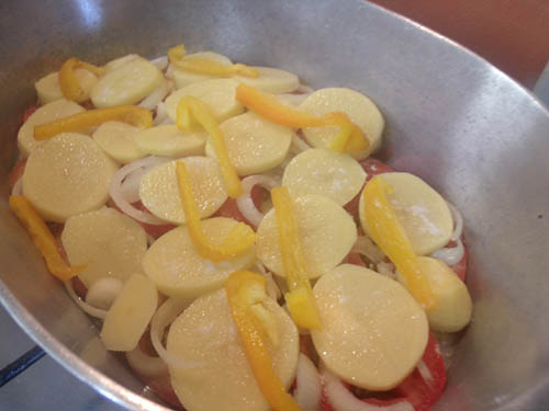 Em uma panela grande, (tanto faz de barro, alumínio ou de ferro) coloque um pouco de gordura, e forre com tomates cortados em rodelas, após cebolas em rodelas, batata inglesa, pimentões em tiras, e salpique um pouco de sal por cima.