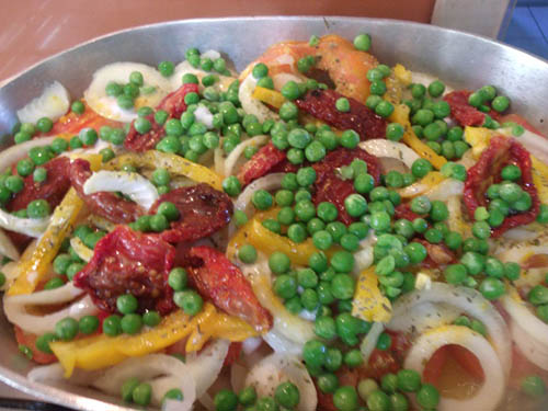 E continue intercalando camadas dos mesmos ingredientes utilizados na primeira camada. Finalize com ervilhas, tomate seco, e 2 colheres de azeite de dende e um pouco de leite de coco e mais uma pitada de sal.