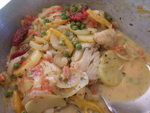 Deixe cozinhar com a panela tampada, verificando seguidamente o cozimento das batatas e do peixe, com um garfo.