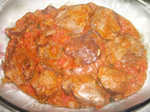 Mignon bovino em postas, ao molho de cebola e tomate, bem cremoso.