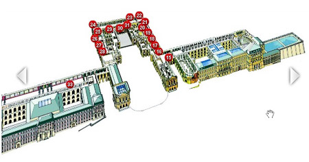 (As arcadas na galeria foram fechadas e substituídas por uma alcova forrada de veludo no Inverno assim como todo o mobiliário e no Verão de tecido de seda bordado com fios de ouro, é este último estado que foi reconstituído)