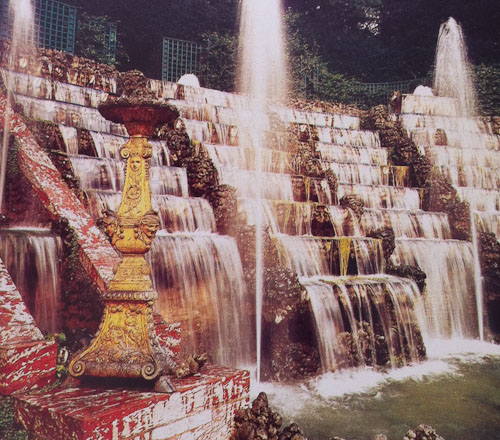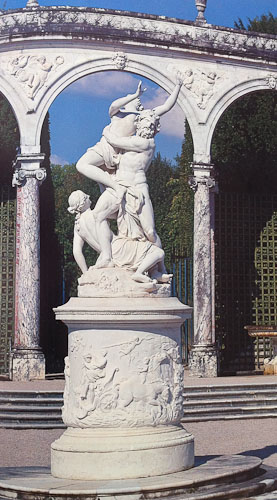 E o outro, frio e perfeito peristilo de 32 colunas que rodeiam uma obra-prima de Girardon, o Rapto de Proserpina por Plutão, é apenas arquitetura e escultura, mármores e águas. Este guache de Cotelle mostra que o centro da sala de Baile era na origem ocupado por uma ilha à qual se tinha acesso através de pequenas pontes. Ceias ou colações, ballets ou teatros musicais podiam serem oferecidos aí à corte como nos outros bosques. (Poderão visualizar no vídeo que fiz dela)