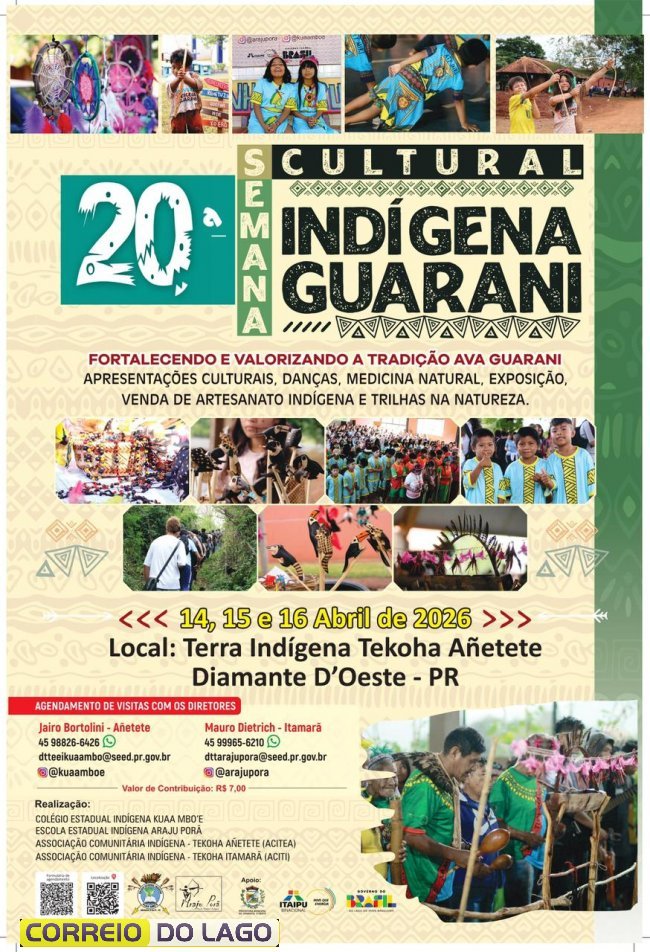 A comunidade escolar do Colégio Estadual Indígena Kuaa Mbo’e, em parceria com a Escola Estadual Indígena Araju Porã e as comunidades Tekohã Añetete e Tekohã Itamarã, promove nos dias 14, 15 e 16 de abril a 20ª Semana Cultural Indígena. O evento convida escolas e a comunidade em geral para vivenciar de perto a riqueza cultural e as tradições do povo Guarani.