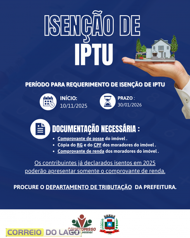 Está aberto o prazo para requerer a isenção do IPTU 2026 em Missal, que segue até o dia 30 de janeiro do próximo ano. Os contribuintes já declarados isentos em 2025 poderão apresentar somente o comprovante de renda e podem fazer o pedido de isenção todas as pessoas que se enquadram no Art. 185 da Lei Municipal nº 1.552 de 29 de setembro de 2020 (Código Tributário Municipal).