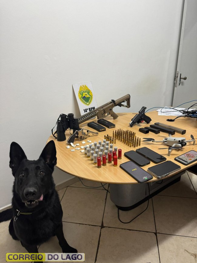 Na madrugada de sábado (25), por volta das 23h, uma operação conduzida por equipes da Polícia Militar do Paraná, por meio do Canil do Batalhão de Polícia Rodoviária (BPRv) e do 14º BPM, resultou na prisão de três homens e na apreensão de armas, munições, drogas e diversos objetos em Foz do Iguaçu.