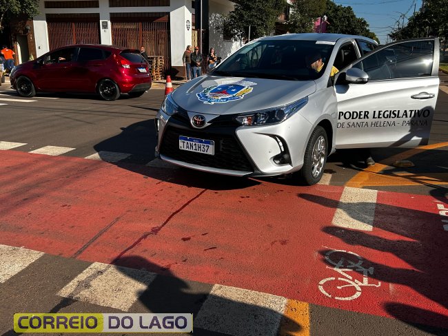 Na manhã desta terça-feira (08), um acidente de trânsito foi registrado no cruzamento entre a Avenida Brasil e a Avenida Curitiba, em Santa Helena. A colisão envolveu um veículo Toyota Yaris, pertencente à Câmara de Vereadores do município e uma motocicleta Honda Biz 125 de cor prata.