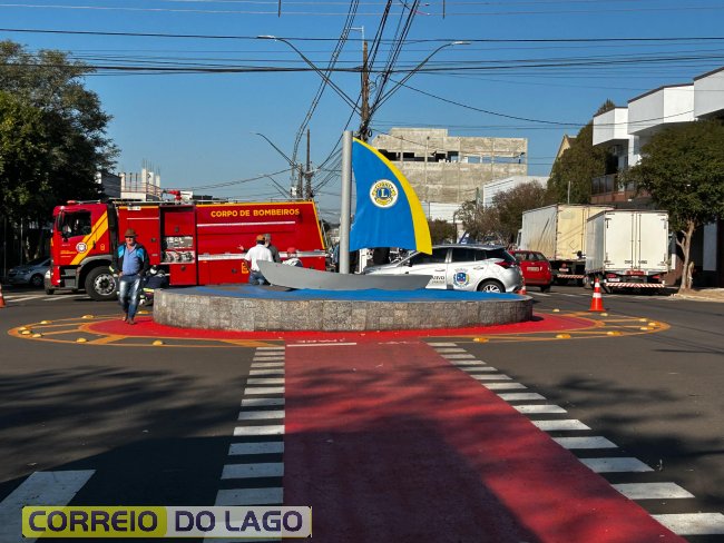 Acidente entre carro da Câmara de Vereadores e motocicleta é registrado em rotatória no centro de Santa Helena