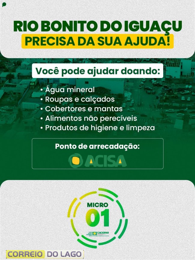 A Associação Comercial e Empresarial de Santa Helena (Acisa) está engajada em uma ação coordenada pela Microrregional 1 da Coordenadoria das Associações Comerciais e Empresariais do Oeste do Paraná (Caciopar) com o objetivo de arrecadar donativos em apoio à população de Rio Bonito do Iguaçu. O município foi duramente atingido por um temporal de grandes proporções que deixou diversas famílias desabrigadas e em situação de necessidade.