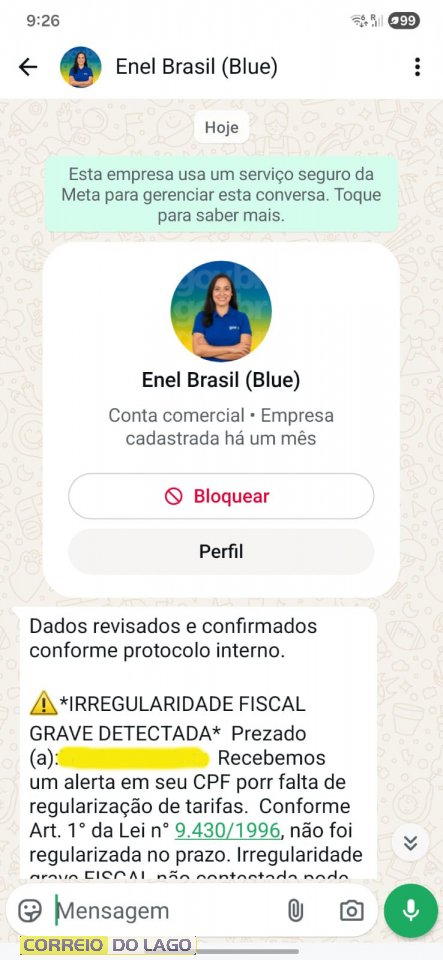Alerta de golpe: tentativa de fraude no whatsApp usa nome da Enel e ameaça fiscal contra santa-helenense