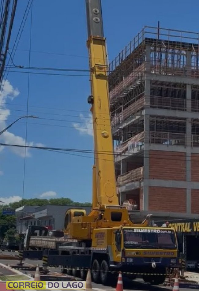 O bloqueio ocorre na altura da Farmácia Real, onde uma grua de grande porte está paralisando o fluxo de veículos. A interdição afeta diretamente o sentido da avenida que leva ao Balneário Terra das Águas.