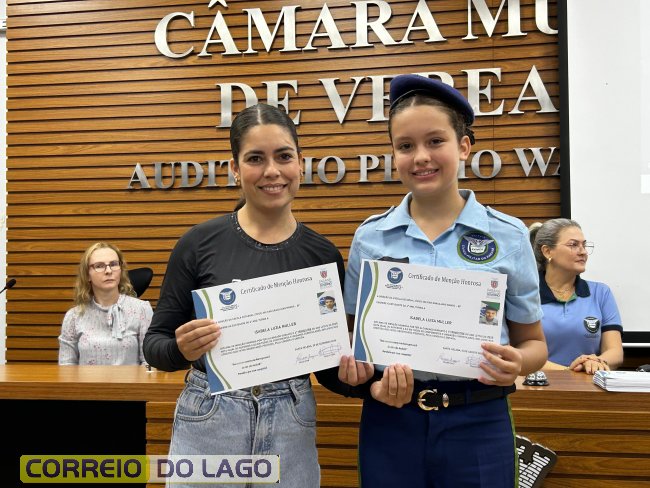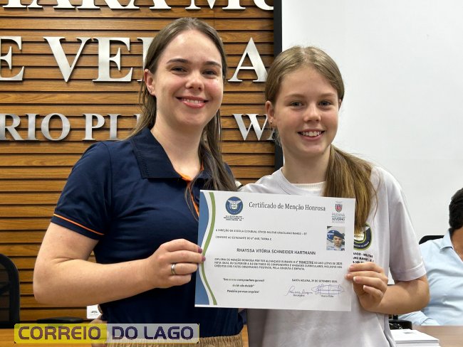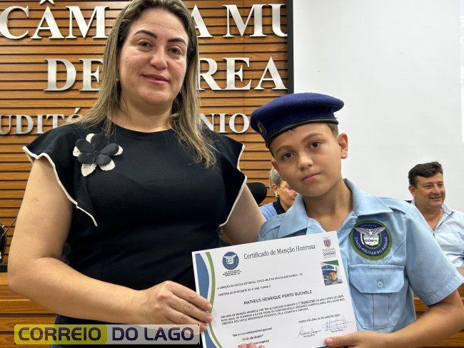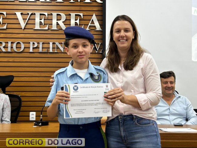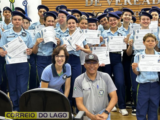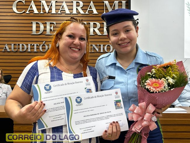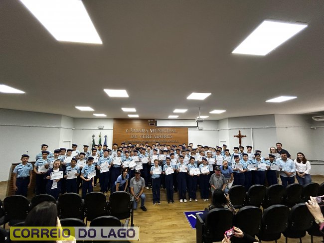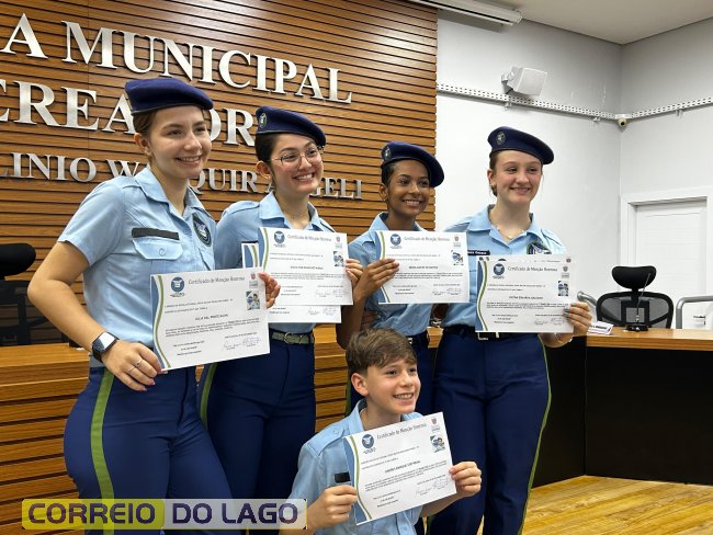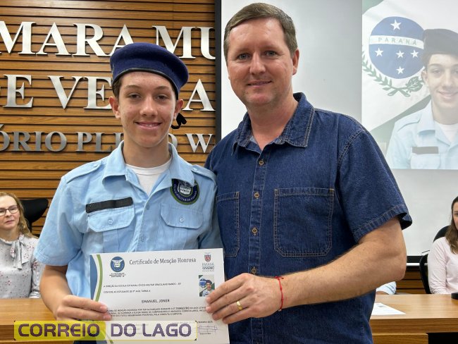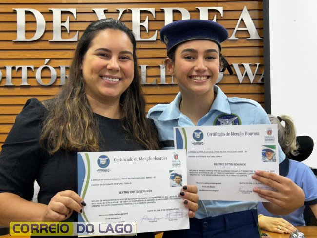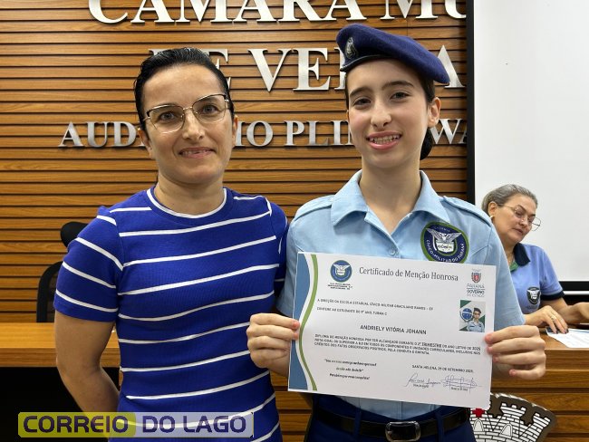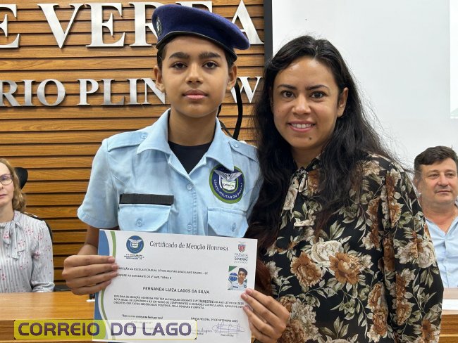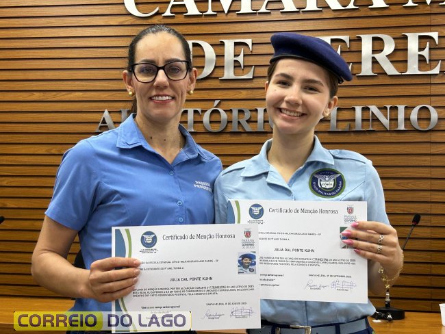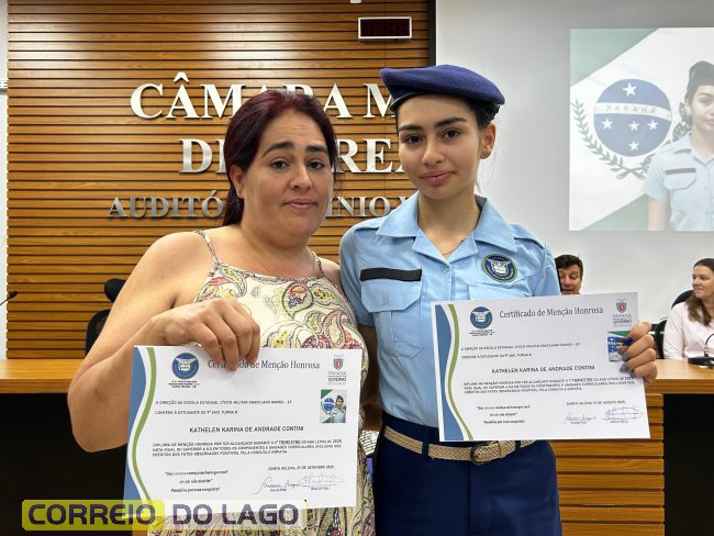 Na manhã desta quarta-feira (01), a Câmara de Vereadores de Santa Helena foi palco de uma solenidade especial da Escola Estadual Cívico-Militar Graciliano Ramos. Durante o evento, alunos que se destacaram nos dois primeiros trimestres receberam certificados de regularidade em suas notas, além de menções honrosas por atitudes exemplares.
