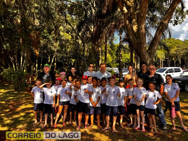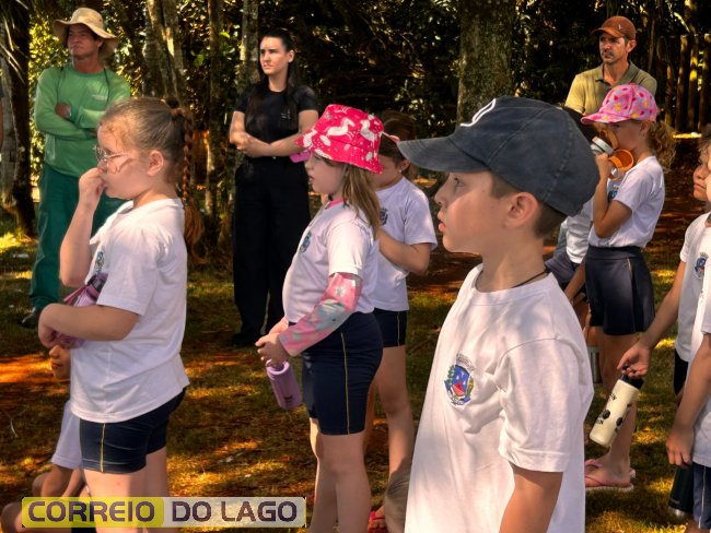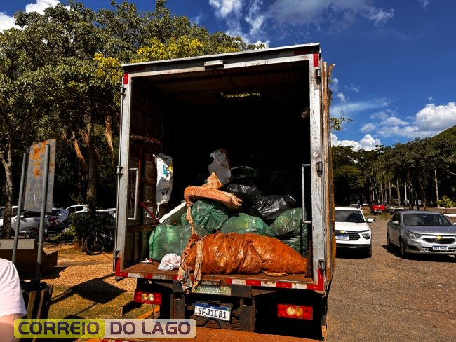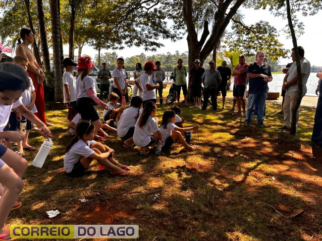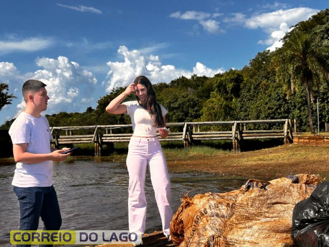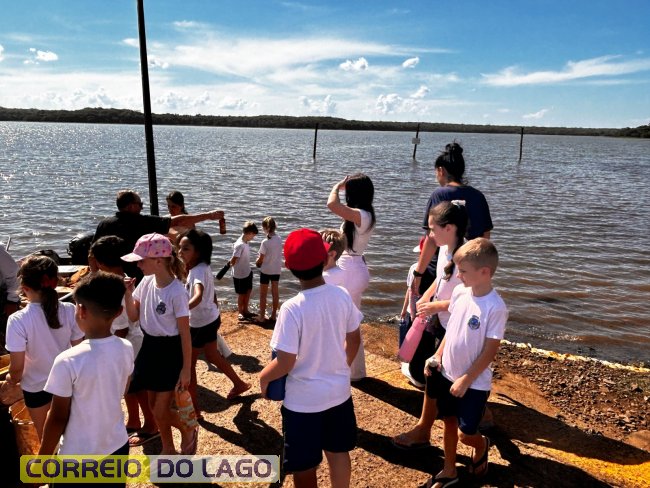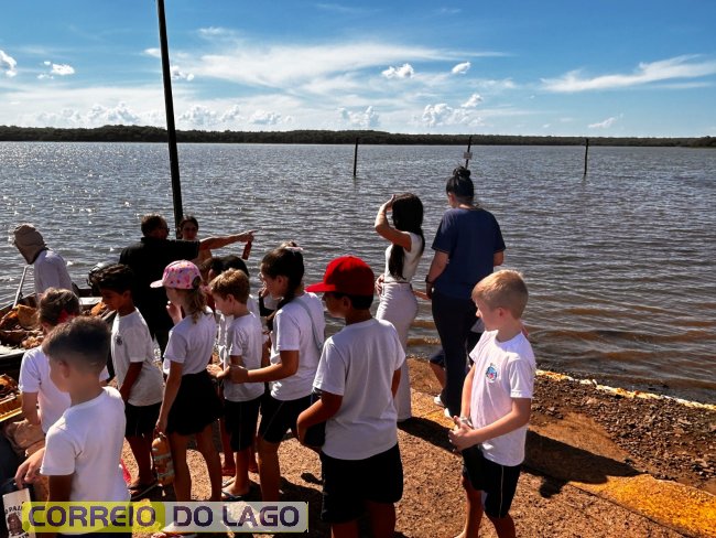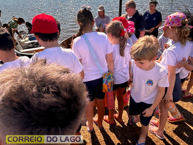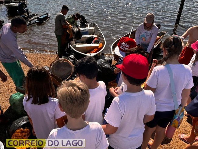Nesta sexta-feira (05), para consolidar o aprendizado de forma prática, alunos da Escola Municipal Professora Inês Mocellin puderam observar de perto a equipe da coleta seletiva carregar o material coletado pelos pescadores às margens do lago.