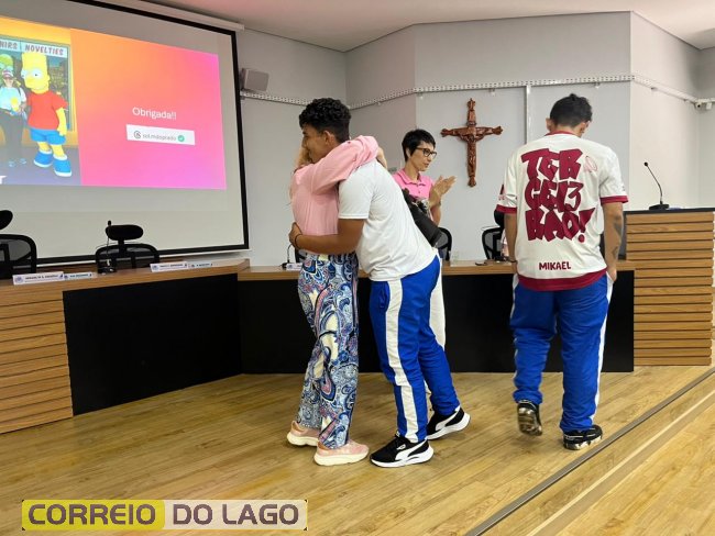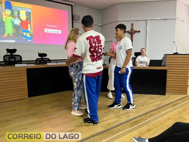 Ao final da palestra, em um gesto de carinho e gratidão, os alunos do Colégio Humberto de Alencar Castelo Branco presentearam a professora Sol do Prado com duas lembranças especiais, simbolizando o reconhecimento pelo aprendizado e pela inspiração proporcionados durante o encontro.