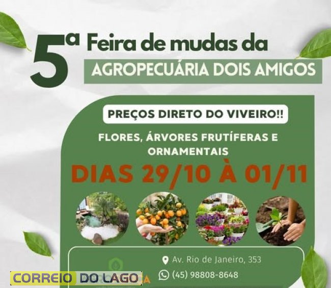 A Agropecuária Dois Amigos - Rede Agroforça de Diamante d'Oeste está com novidades para quem gosta de cuidar da terra e da natureza. A 5ª Feira de Mudas acontece nesta quinta-feira (29) até sábado (1º) de novembro, trazendo uma grande variedade de flores, árvores frutíferas, plantas ornamentais e espécies ideais para jardinagem. O evento promete atrair produtores, jardineiros e amantes das plantas, com preços diretos do viveiro.