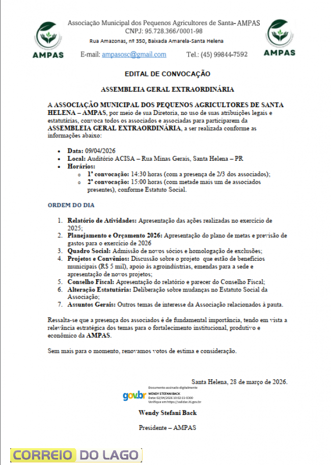 A Associação Municipal dos Pequenos Agricultores de Santa Helena (AMPAS) por meio da sua diretoria convoca todos os seus associados para uma Assembleia Geral Extraordinária de caráter decisivo. O evento, que promete definir as diretrizes do trabalho no campo para o próximo ano, será realizado no dia 09 de abril de 2026, no Auditório da ACISA, no centro da cidade.