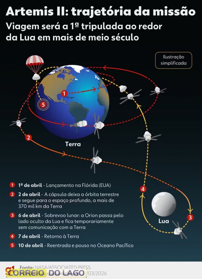Mas quando exatamente os astronautas vão ver a Lua de perto? O que acontece entre o lançamento desta última quarta-feira (1º) e o pouso no Pacífico, no dia 10 de abril?