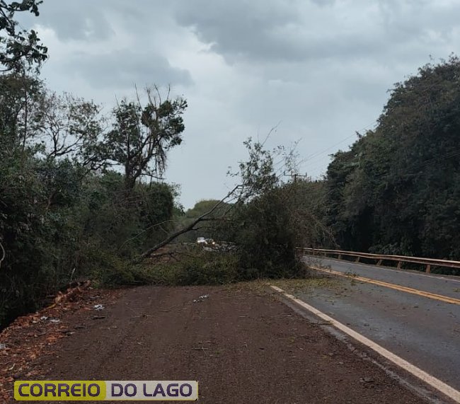 Uma árvore caiu na PR-317, entre Santa Helena e o distrito de Sub-Sede, nas proximidades da ponte sobre o rio São Francisco Falso.