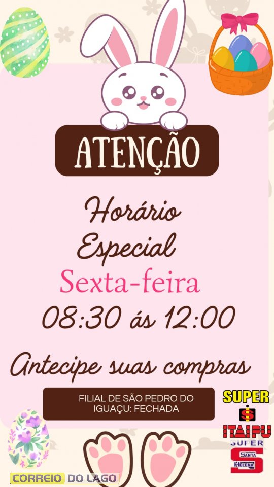 O Super Itaipu e o Super Santa Helena terão atendimento em horário especial nesta sexta-feira (3), das 8h30 às 12h. Antecipe as compras de Páscoa para evitar imprevistos e garantir mais praticidade.