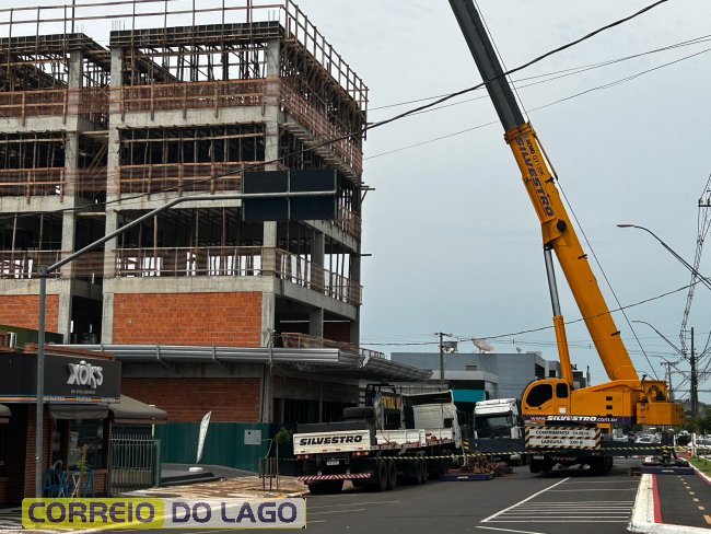O bloqueio, que acontece em frente ao Fórum Municipal, é fundamental para garantir a segurança durante a operação de um guindaste de grande porte (grua) em uma obra de construção civil na cidade.