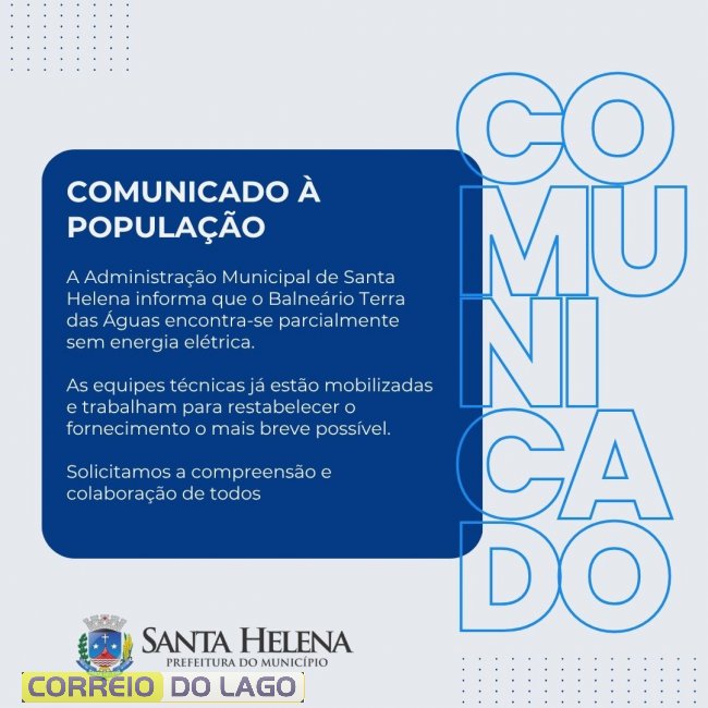A Administração Municipal de Santa Helena informa que o Balneário Terra das Aguas encontra-se parcialmente sem energia elétrica.