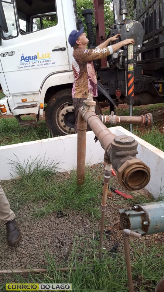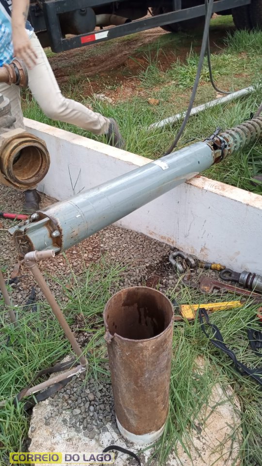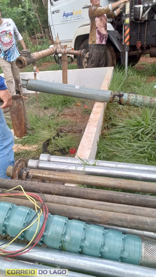 Pesca bem-sucedida! Com o suporte técnico da empresa Água Luz, a bomba d’água que havia caído no poço artesiano foi pescada no final da tarde, por volta das 18h, conforme a previsão inicial.