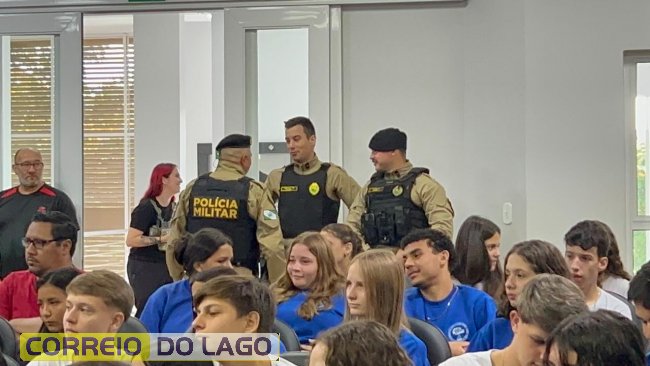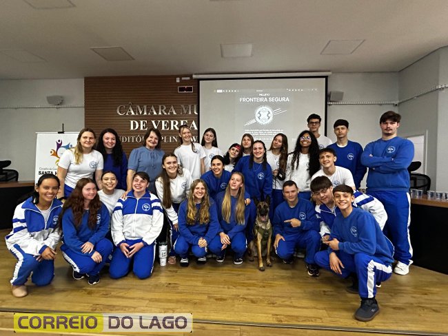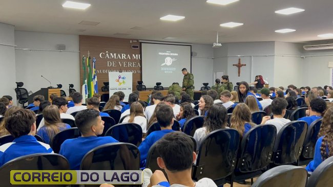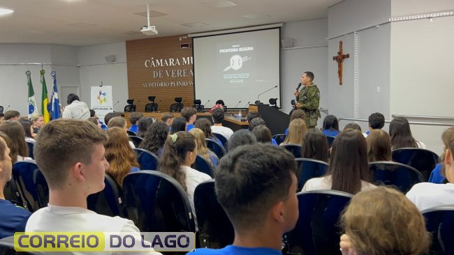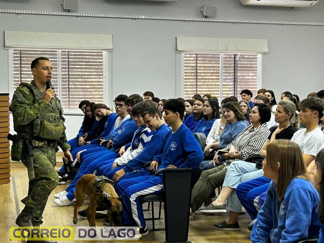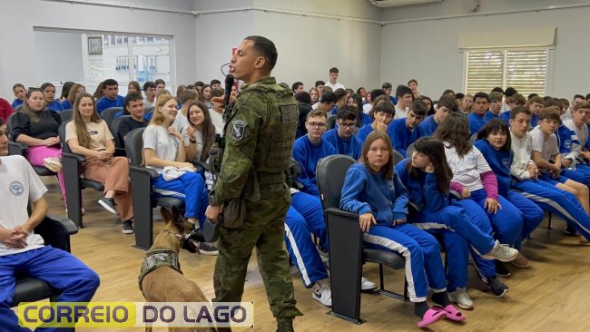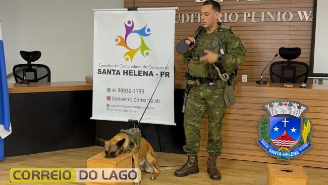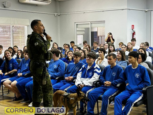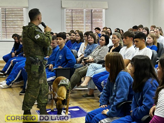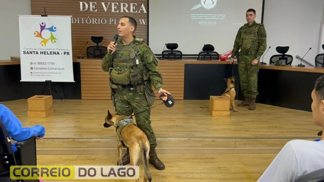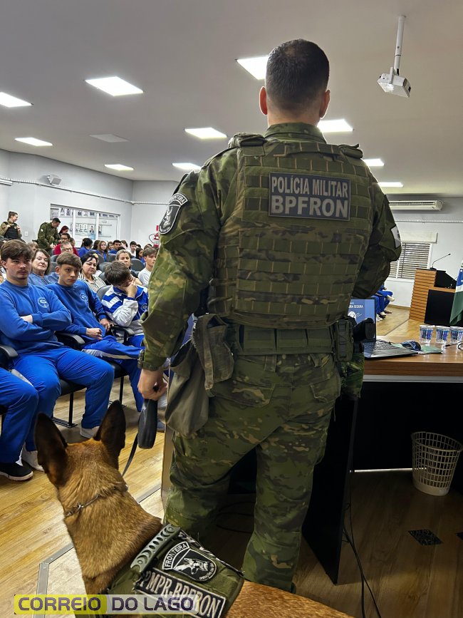 Na manhã desta quinta-feira (02), alunos da Escola Estadual Humberto de Alencar Castelo Branco participaram de uma apresentação realizada pelo Batalhão de Polícia de Fronteira (BPFron) em parceria com o Conselho da Comunidade, na Câmara de Vereadores de Santa Helena.